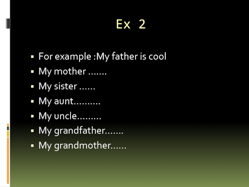Ex 2For example :My father is coolMy mother …….My sister ……My aunt……….My uncle………My grandfather…….My grandmother……