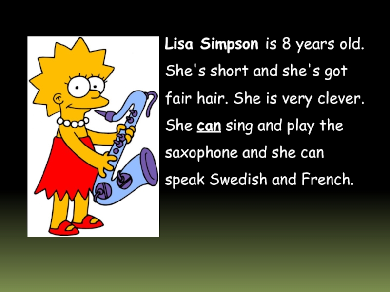 Слайд 14Lisa Simpson is 8 years old. She's short and she's got