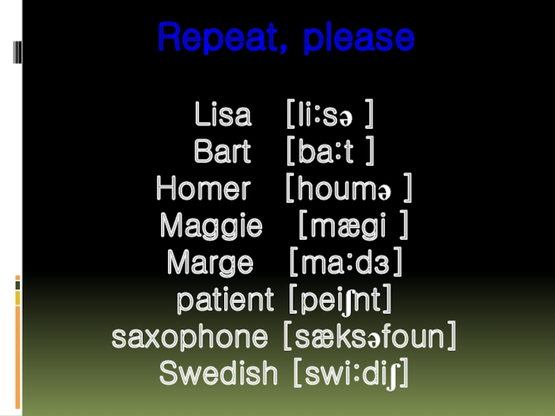 Repeat, pleaseLisa  [li:sə ]Bart  [ba:t ]Homer  [houmə ]Maggie  [mægi ] Marge  [ma:dз]patient