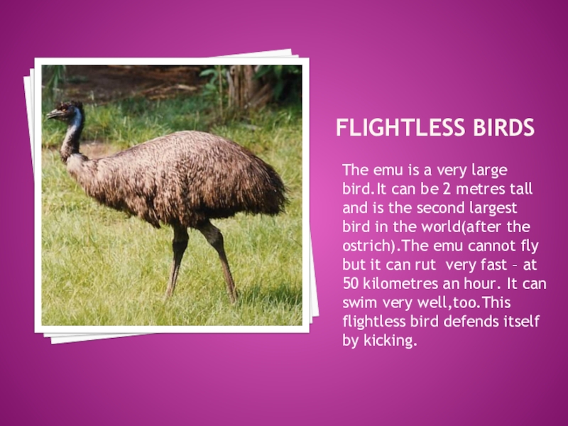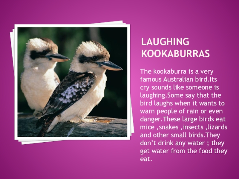like someone is laughing.Some say that the bird laughs when it wants to warn people of rain or even danger.These large birds eat mice ,snakes ,insects ,lizards and other small birds.They don’t drink any water ; they get water from the food they eat.