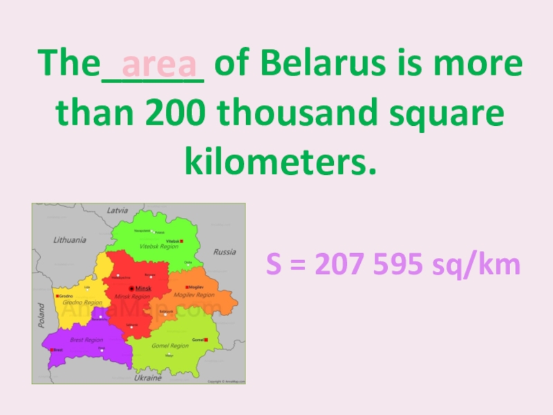 The_____ of Belarus is more than 200 thousand square kilometers.areaS = 207 595 sq/km
