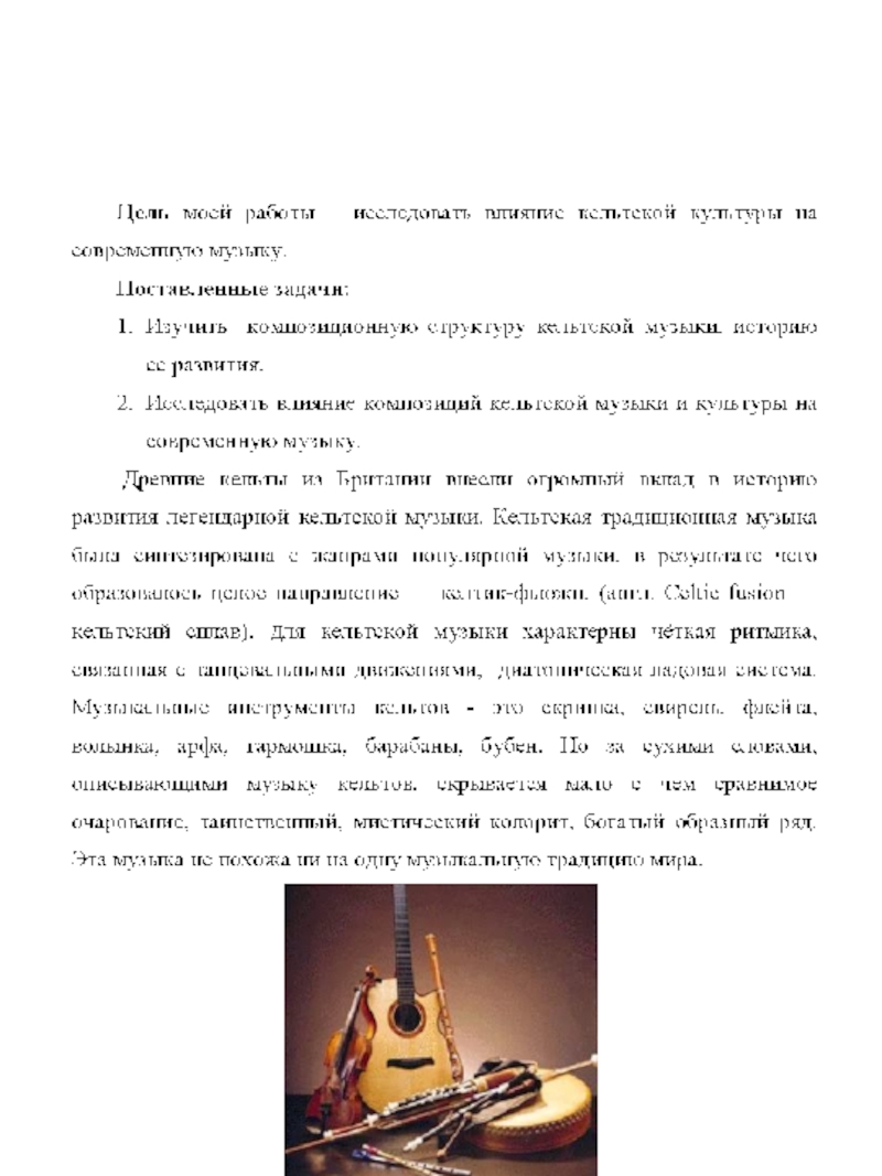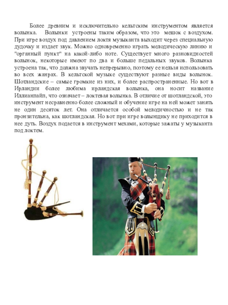 что это мешок с воздухом. При игре воздух под давлением локтя музыканта выходит через специальную дудочку и издает звук. Можно одновременно играть мелодическую линию и "органный пункт" на какой-либо ноте. Существует много разновидностей волынок, некоторые имеют по два и больше педальных звуков. Волынка устроена так, что должна звучать непрерывно, поэтому ее нельзя использовать во всех жанрах. В кельтской музыке существуют разные виды волынок. Шотландские – самые громкие из них, и более распространенные. Но вот в Ирландии более любима ирландская волынка, она носит название Иллианпайп, что означает – локтевая волынка. В отличие от шотландской, это инструмент несравненно более сложный и обучение игре на ней может занять не один десяток лет. Она отличается особой мелодичностью и не так пронзительна, как шотландская. Но вот при игре волынщику не приходится в нее дуть. Воздух подается в инструмент мехами, которые зажаты у музыканта под локтем.