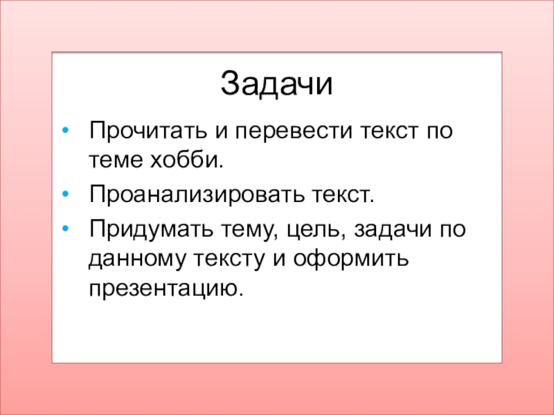 Задачи Прочитать и перевести текст по теме хобби.Проанализировать текст.Придумать тему, цель, задачи по данному тексту и оформить
