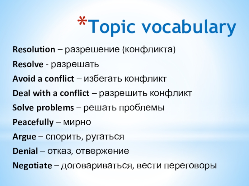 Topic vocabularyResolution – разрешение (конфликта)Resolve - разрешатьAvoid a conflict – избегать конфликтDeal with a conflict – разрешить