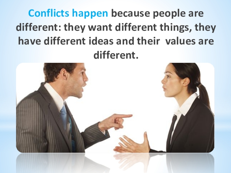 Слайд 3Conflicts happen because people are different: they want different things, they