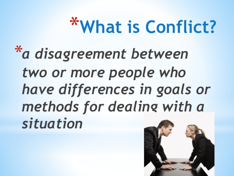 What is Conflict?a disagreement between two or more people who have differences in goals or methods for
