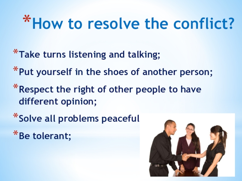 How to resolve the conflict?Take turns listening and talking;Put yourself in the shoes of another person;Respect the