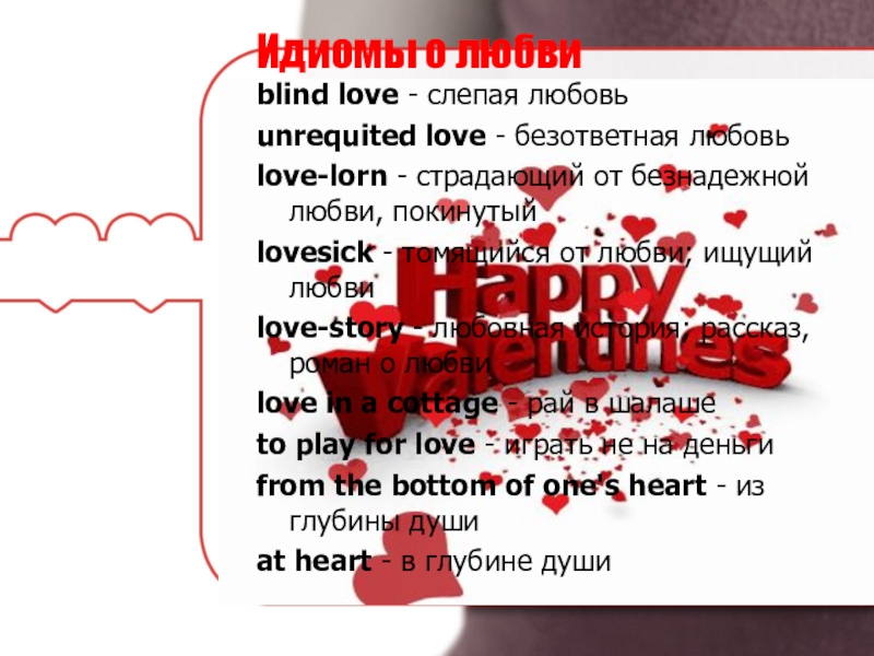 Идиомы о любви blind love - слепая любовьunrequited love - безответная любовьlove-lorn - страдающий от безнадежной любви, покинутыйlovesick - томящийся от
