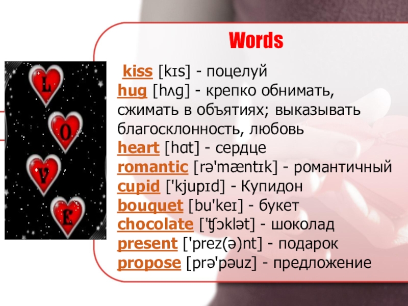 Words	kiss [kɪs] - поцелуй hug [hʌg] - крепко обнимать, сжимать в объятиях; выказывать благосклонность, любовь heart [hɑːt] - сердце romantic [rə'mæntɪk] - романтичный cupid ['kjuːpɪd] - Купидон