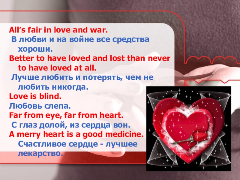 All’s fair in love and war. В любви и на войне все средства хороши.Better to have loved and lost than never to have loved at all.  Лучше любить и потерять, чем не любить никогда.Love is blind.