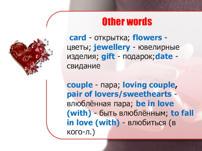 Other words	card - открытка; flowers - цветы; jewellery - ювелирные изделия; gift - подарок;date - свидание  couple - пара; loving couple, pair of lovers/sweethearts - влюблённая пара; be