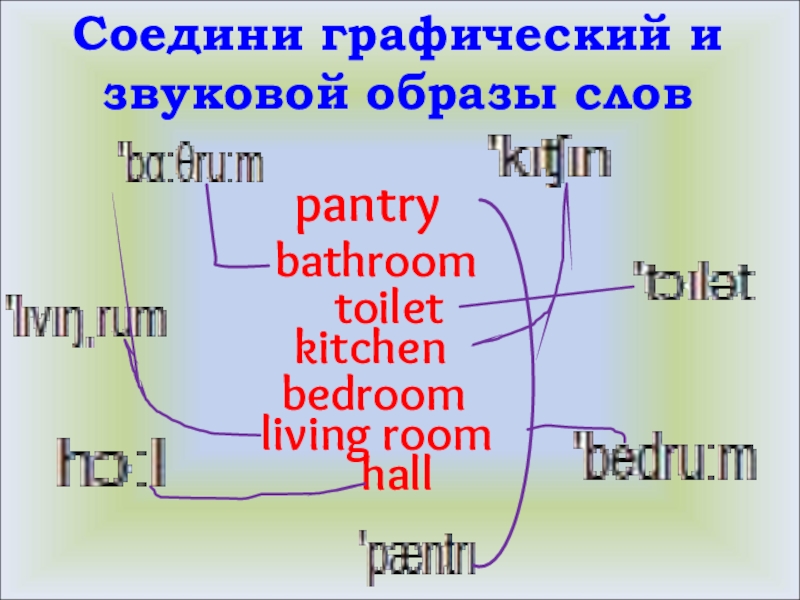Соедини графический и звуковой образы словpantrybathroomtoiletkitchenbedroomliving roomhall