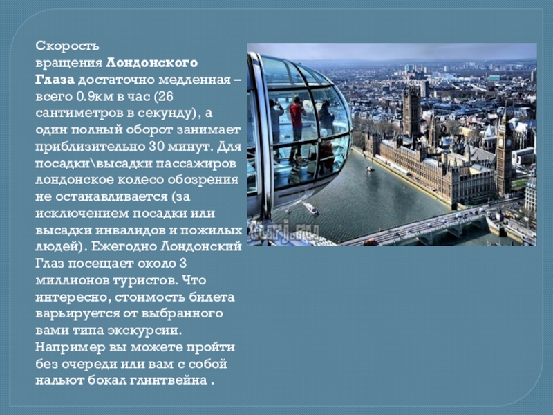 Слайд 5Скорость вращения Лондонского Глаза достаточно медленная – всего 0.9км в час (26 сантиметров