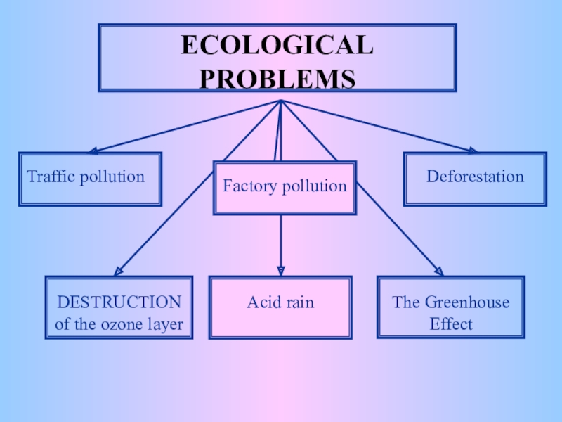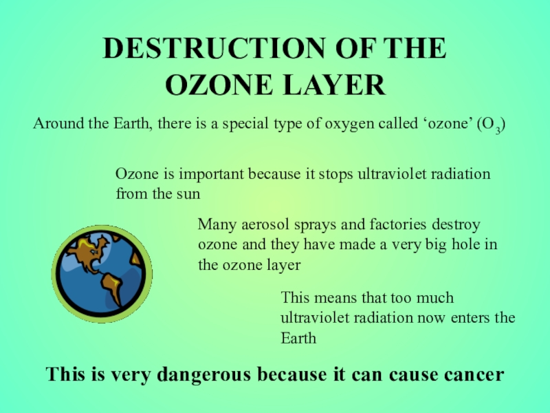 Many aerosol sprays and factories destroy ozone and they have made a very big hole in the ozone layer