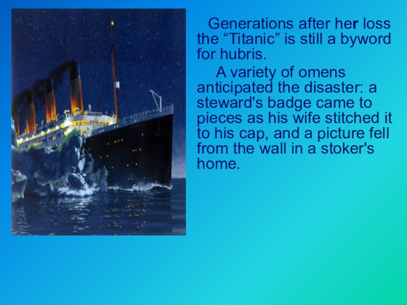 Слайд 10 Generations after her loss the “Titanic” is still a