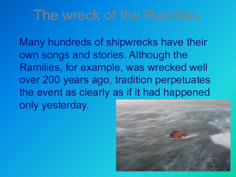 their own songs and stories. Although the Ramilies, for example, was wrecked well over 200 years ago, tradition perpetuates the event as clearly as if it had happened only yesterday.