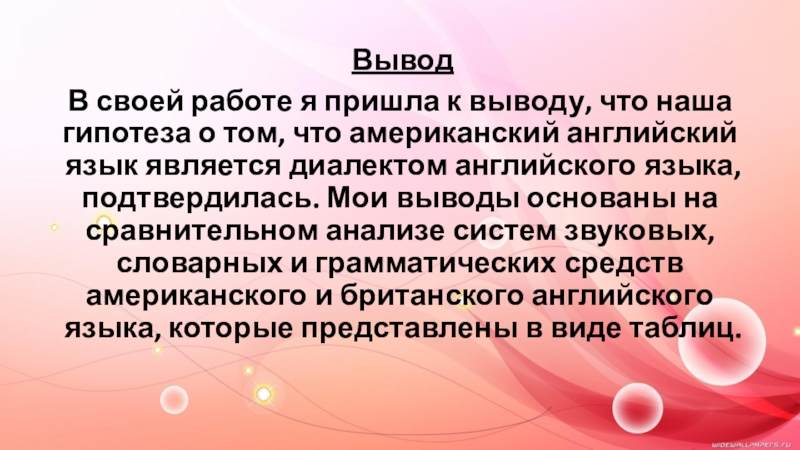 о том, что американский английский язык является диалектом английского языка, подтвердилась. Мои выводы основаны на сравнительном анализе систем звуковых, словарных и грамматических средств американского и британского английского языка, которые представлены в виде таблиц.