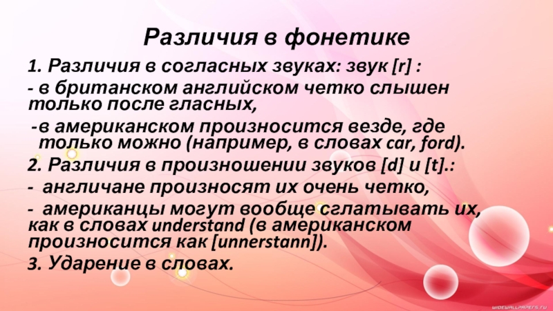 - американцы могут вообще сглатывать их, как в словах understand (в американском произносится как [unnerstann]).