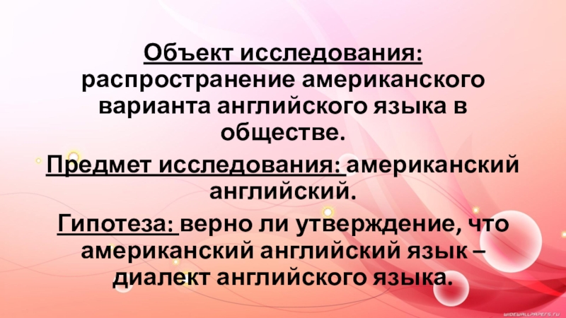 Слайд 4Объект исследования: распространение американского варианта английского языка в обществе.