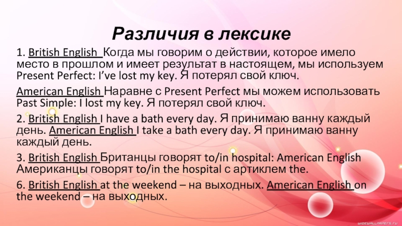 6. British English at the weekend – на выходных. American English on the weekend – на выходных.