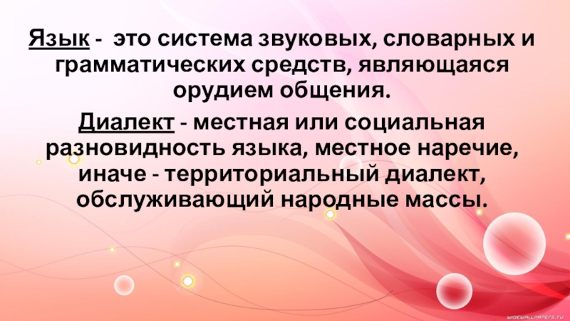Диалект - местная или социальная разновидность языка, местное наречие, иначе - территориальный диалект, обслуживающий народные массы.
