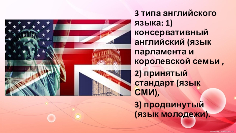 Слайд 53 типа английского языка: 1) консервативный английский (язык парламента и королевской