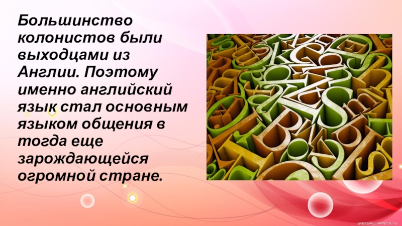 Слайд 8Большинство колонистов были выходцами из Англии. Поэтому именно английский язык стал