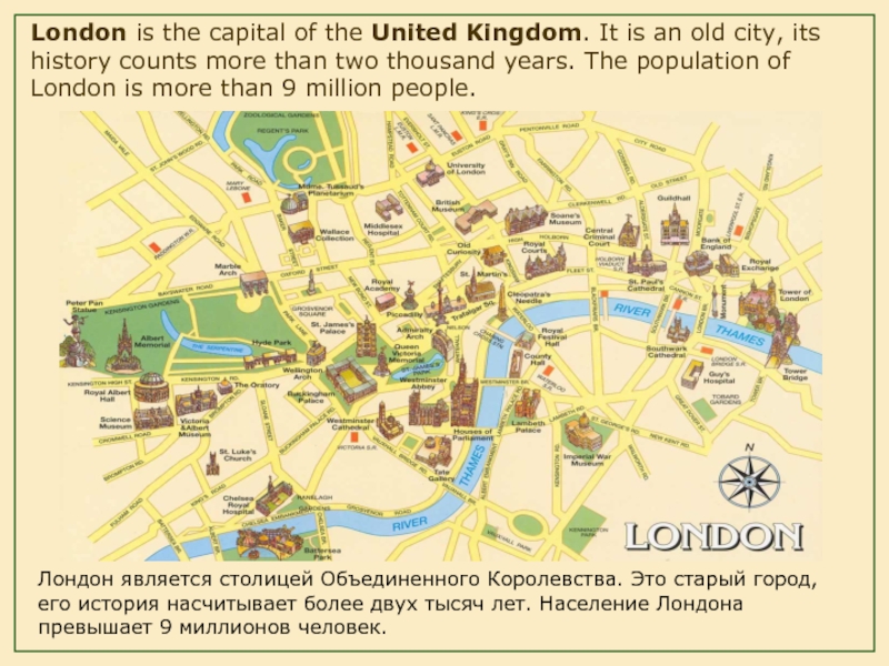Лондон является столицей Объединенного Королевства. Это старый город, его история насчитывает более двух тысяч лет. Население Лондона превышает 9 миллионов человек.
