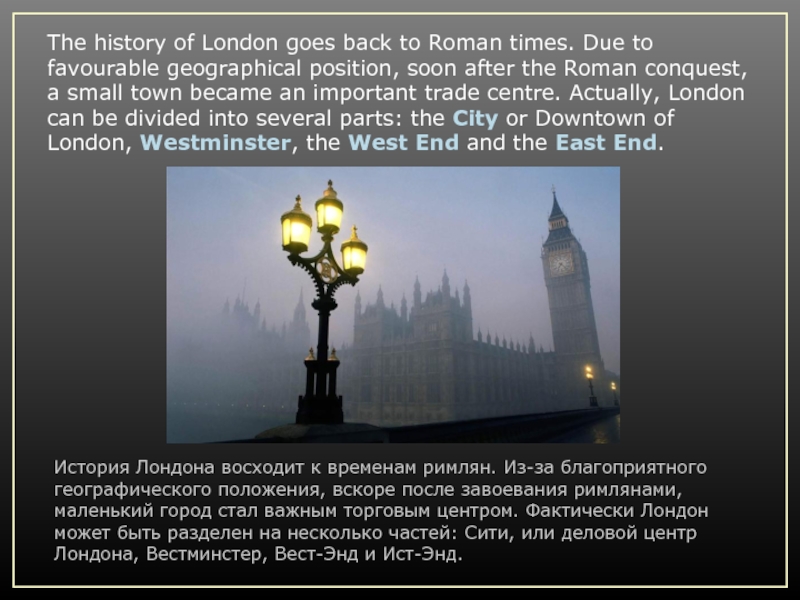 История Лондона восходит к временам римлян. Из-за благоприятного географического положения, вскоре после завоевания римлянами, маленький город стал важным торговым центром. Фактически Лондон может быть разделен на несколько частей: Сити, или деловой центр Лондона, Вестминстер, Вест-Энд и Ист-Энд.