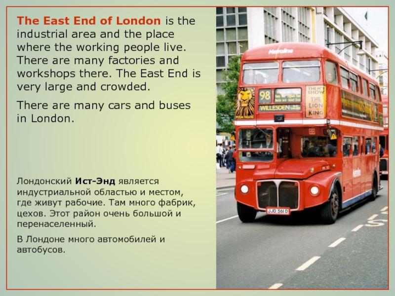 Лондонский Ист-Энд является индустриальной областью и местом, где живут рабочие. Там много фабрик, цехов. Этот район очень большой и перенаселенный.