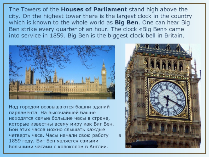 Над городом возвышаются башни зданий парламента. На высочайшей башне находятся самые большие часы в стране, которые известны всему миру как Биг Бен. Бой этих часов можно слышать каждые четверть часа. Часы начали свою работу в 1859 году. Биг Бен является самыми большими часами с колоколом в Англии.