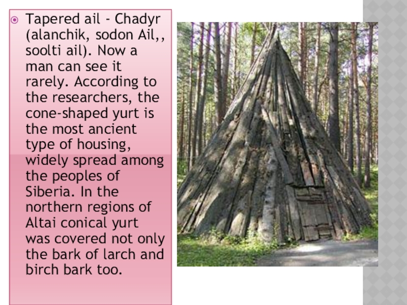 Слайд 8Tapered ail - Chadyr (alanchik, sodon Ail,, soolti ail). Now a