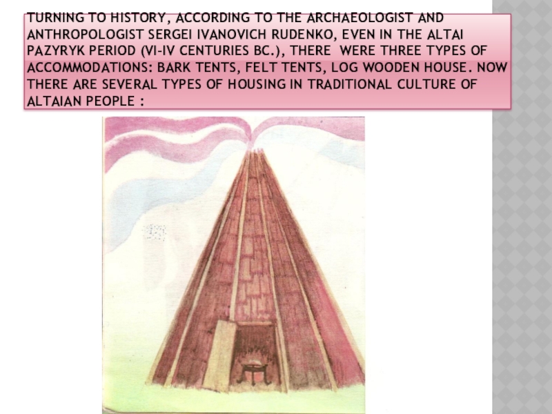RUDENKO, EVEN IN THE ALTAI PAZYRYK PERIOD (VI-IV CENTURIES BC.), THERE WERE THREE TYPES OF ACCOMMODATIONS: BARK TENTS, FELT TENTS, LOG WOODEN HOUSE. NOW THERE ARE SEVERAL TYPES OF HOUSING IN TRADITIONAL CULTURE OF ALTAIAN PEOPLE :