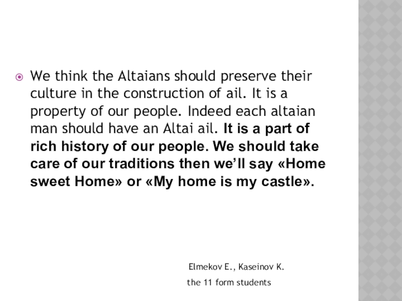 Слайд 14We think the Altaians should preserve their culture in the construction