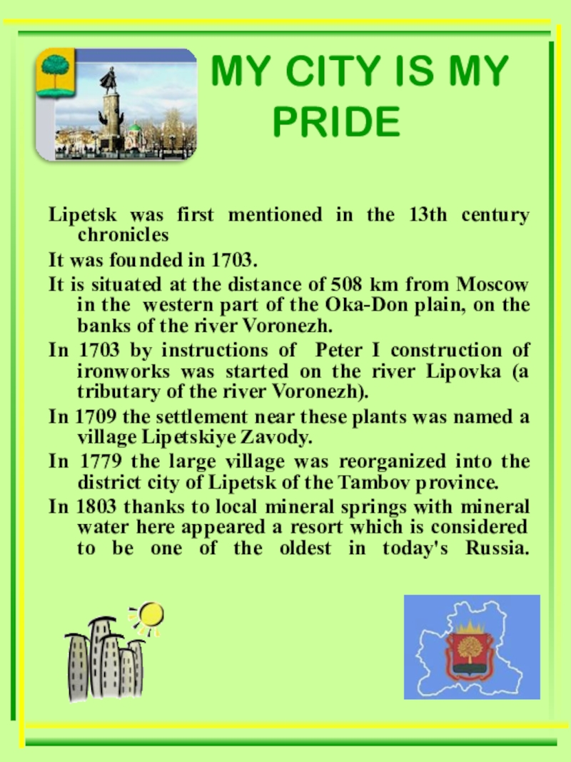 In 1703 by instructions of Peter I construction of ironworks was started on the river Lipovka (a tributary of the river Voronezh).