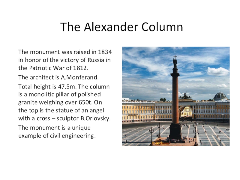 Total height is 47.5m. The column is a monolitic pillar of polished granite weighing over 650t. On the top is the statue of an angel with a cross – sculptor B.Orlovsky.