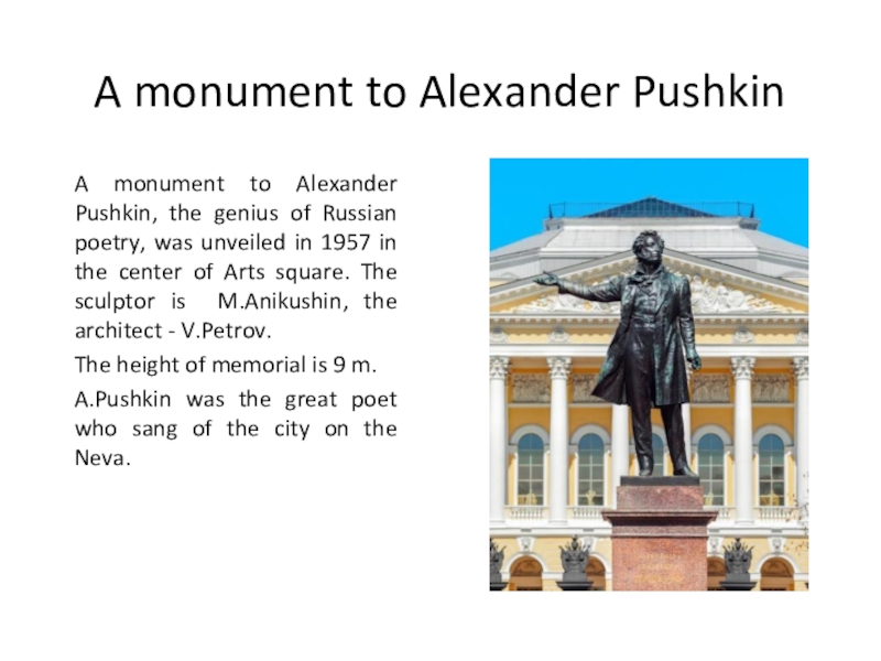 of Russian poetry, was unveiled in 1957 in the center of Arts square. The sculptor is M.Anikushin, the architect - V.Petrov.