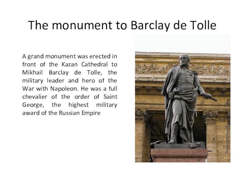 front of the Kazan Cathedral to Mikhail Barclay de Tolle, the military leader and hero of the War with Napoleon. He was a full chevalier of the order of Saint George, the highest military award of the Russian Empire