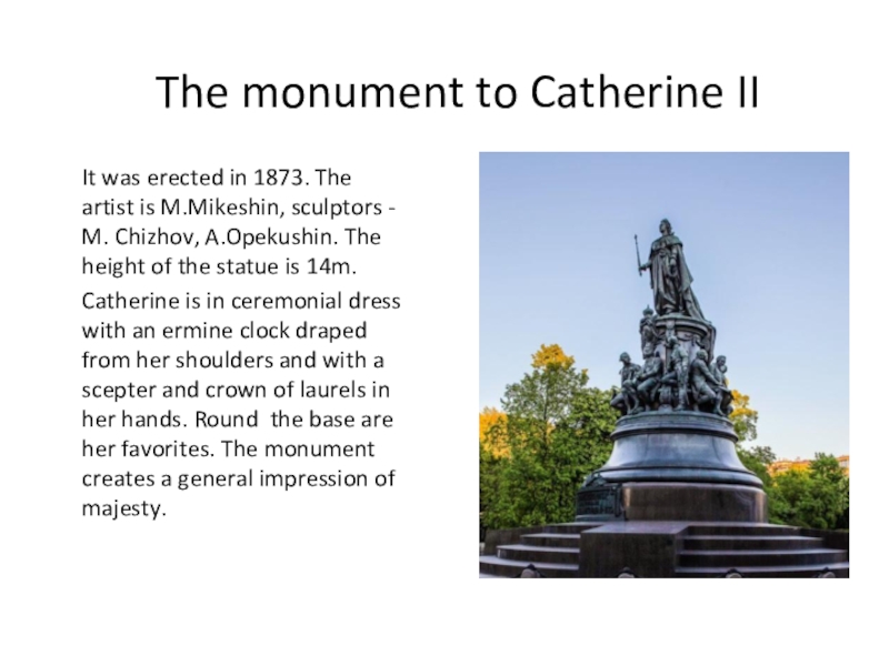 The monument to Catherine IIIt was erected in 1873. The artist is M.Mikeshin, sculptors - M. Chizhov,