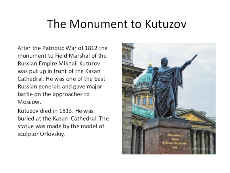 Kutuzov died in 1813. He was buried at the Kazan Cathedral. The statue was made by the model of sculptor Orlovskiy.