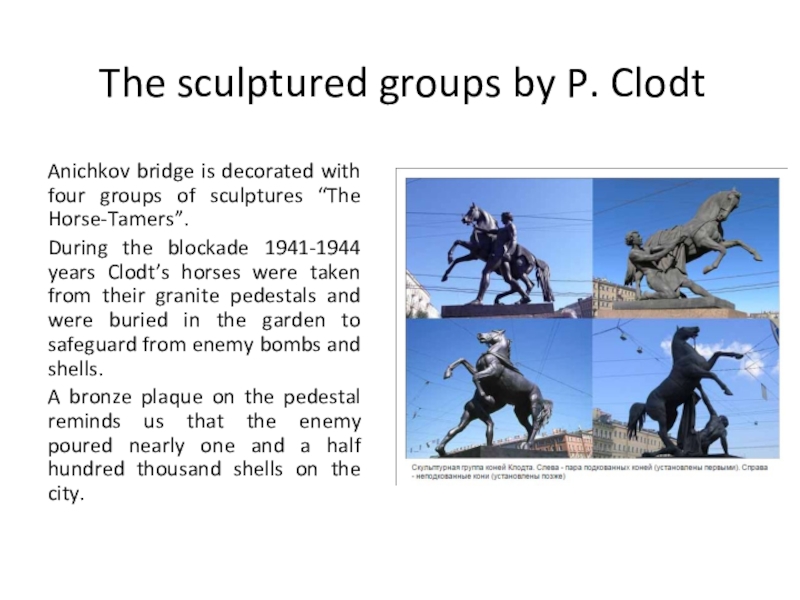 The sculptured groups by P. ClodtAnichkov bridge is decorated with four groups of sculptures “The Horse-Tamers”.During the