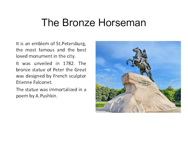 The Bronze HorsemanIt is an emblem of St.Petersburg, the most famous and the best loved monument in the city.It was unveiled in 1782. The bronze statue of Peter the Great was designed by French sculptor Etienne