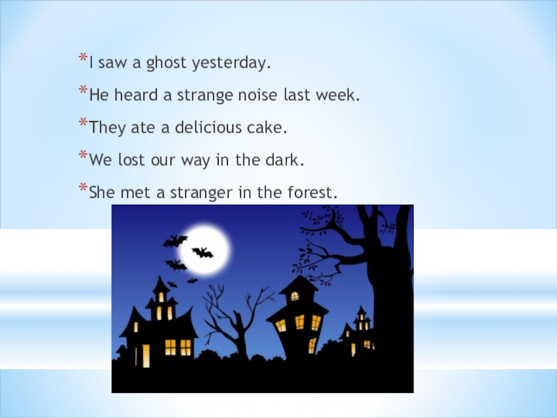I saw a ghost yesterday.He heard a strange noise last week.They ate a delicious cake.We lost our
