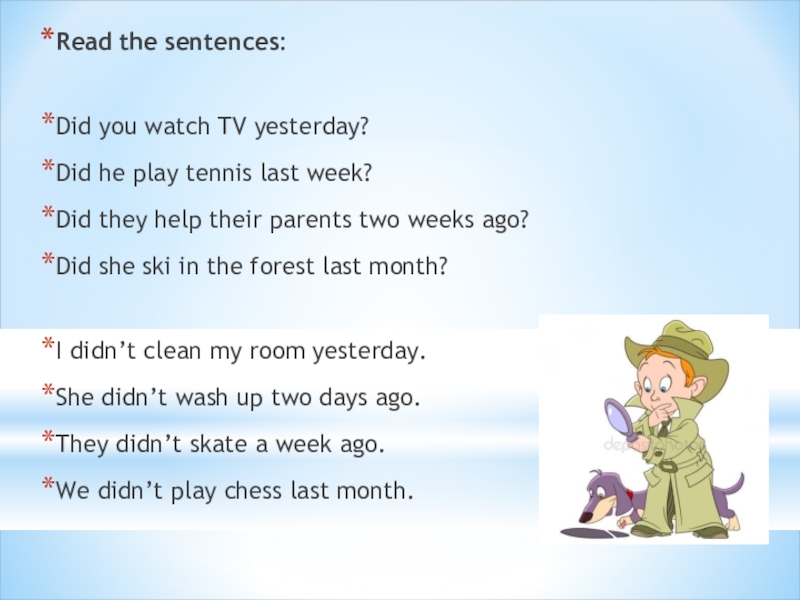 Read the sentences:Did you watch TV yesterday?Did he play tennis last week?Did they help their parents two