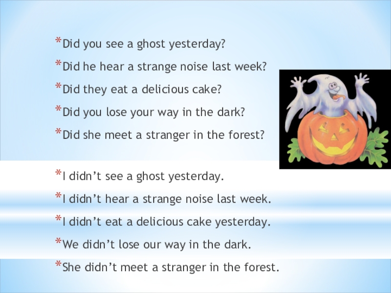 Did you see a ghost yesterday?Did he hear a strange noise last week?Did they eat a delicious
