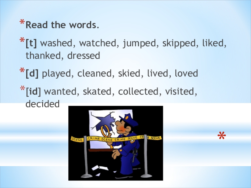 Read the words.[t] washed, watched, jumped, skipped, liked, thanked, dressed[d] played, cleaned, skied, lived, loved[id] wanted,