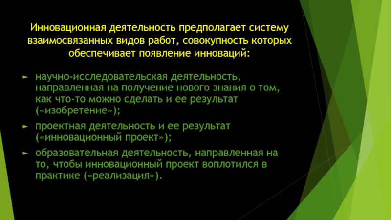 образовательная деятельность, направленная на то, чтобы инновационный проект воплотился в практике («реализация»).