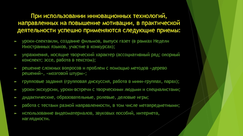 использование видеоматериалов, звуковых пособий, интернета, наглядности.