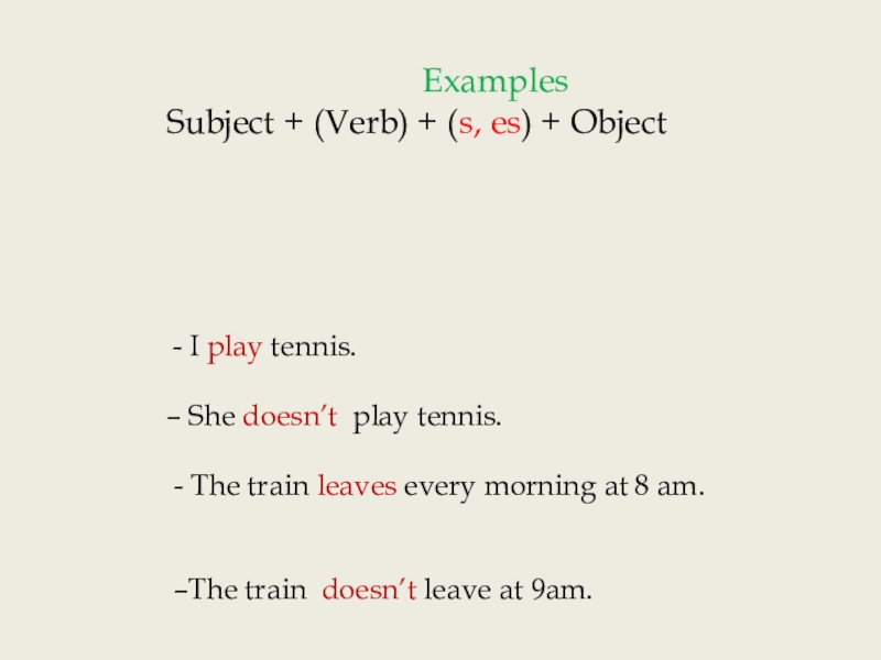 Examples Subject + (Verb) + (s, es) + Object - I play tennis. – She doesn’t play