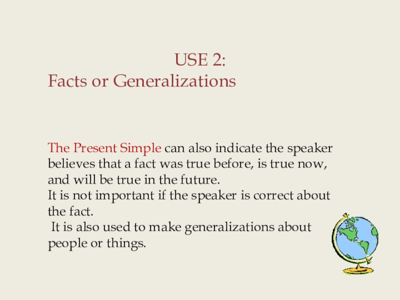 USE 2: Facts or Generalizations      The Present Simple can also indicate the speaker believes that a fact